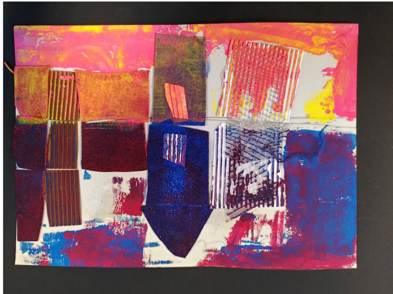 De kinderen knippen van foam huizen. Er is een middenlijn. Daaronder worden dezelfde huizen gespiegeld in het water. Als de lijm droog is rollen we, na elkaar twee kleuren verf op de bovenste helft van het papier. Met een drukpers wordt er een afdruk gemaakt op een dik wit papier. Daarna doen we hetzelfde met de onderkant van het papier.