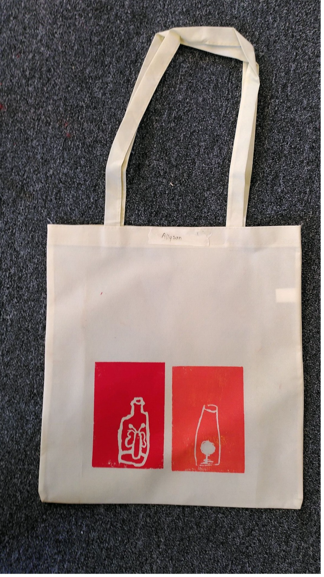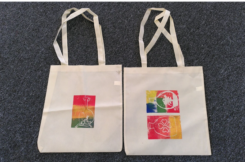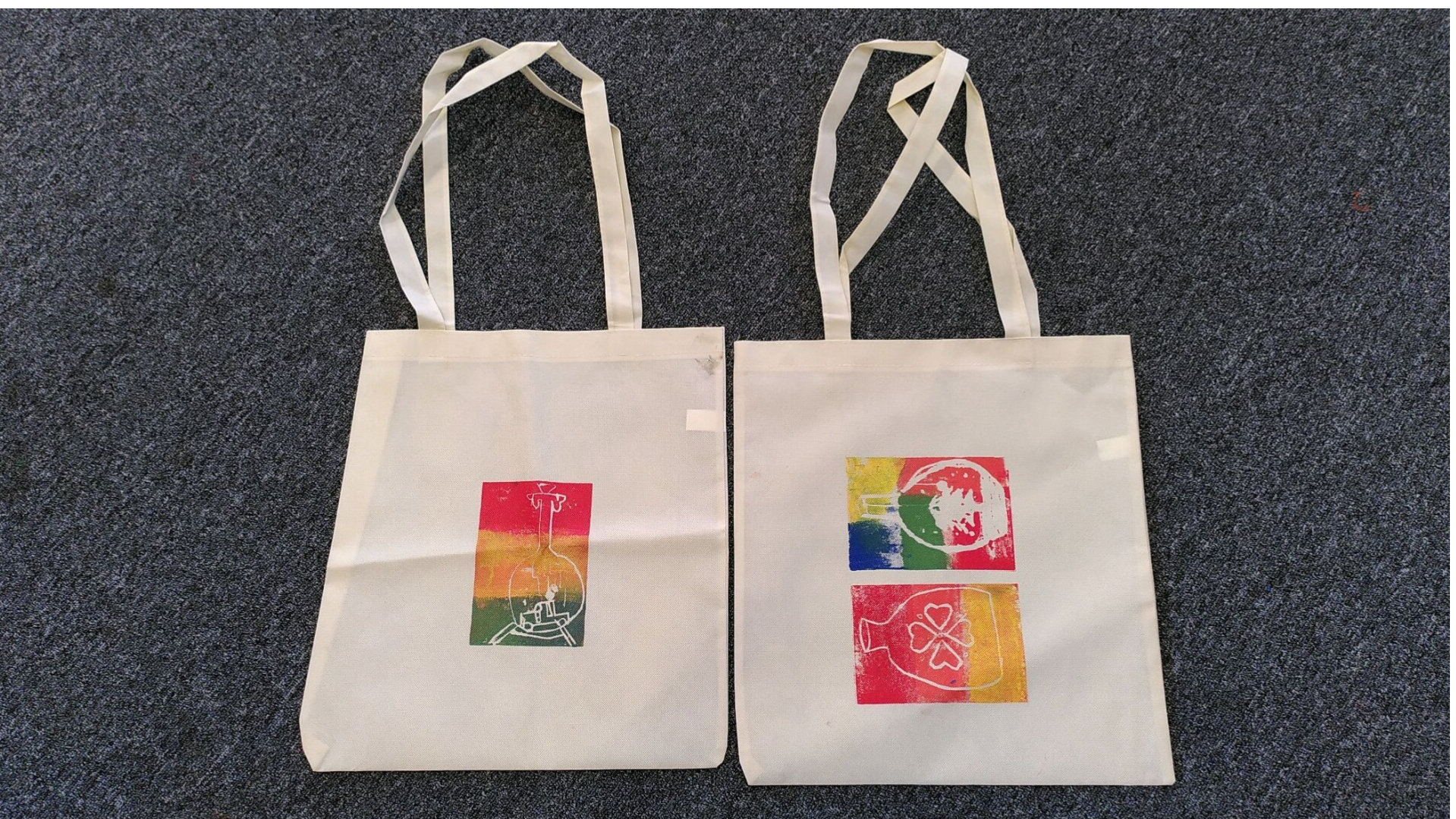 De kinderen hebben een tas met een opdruk van flessen gemaakt.